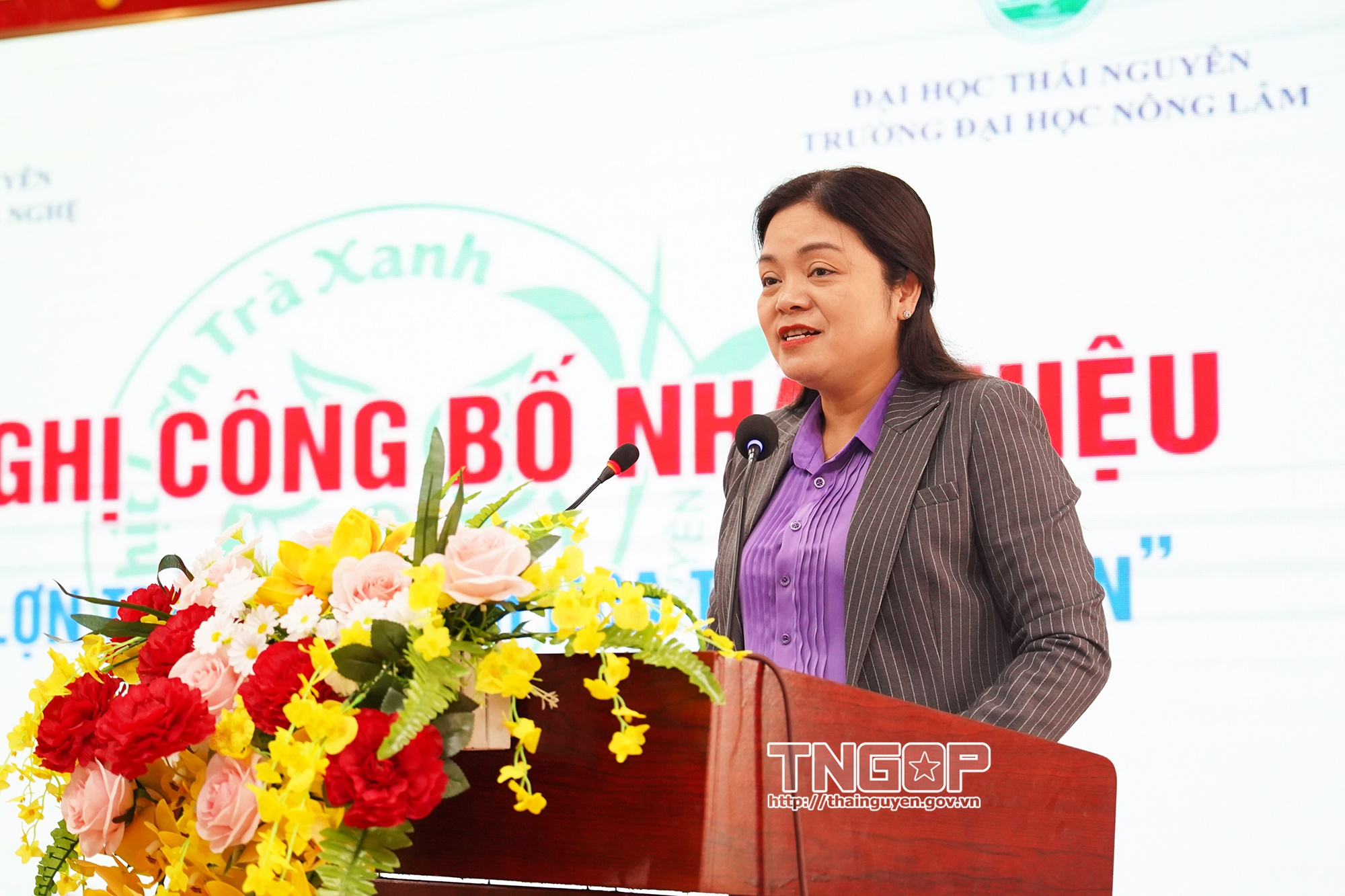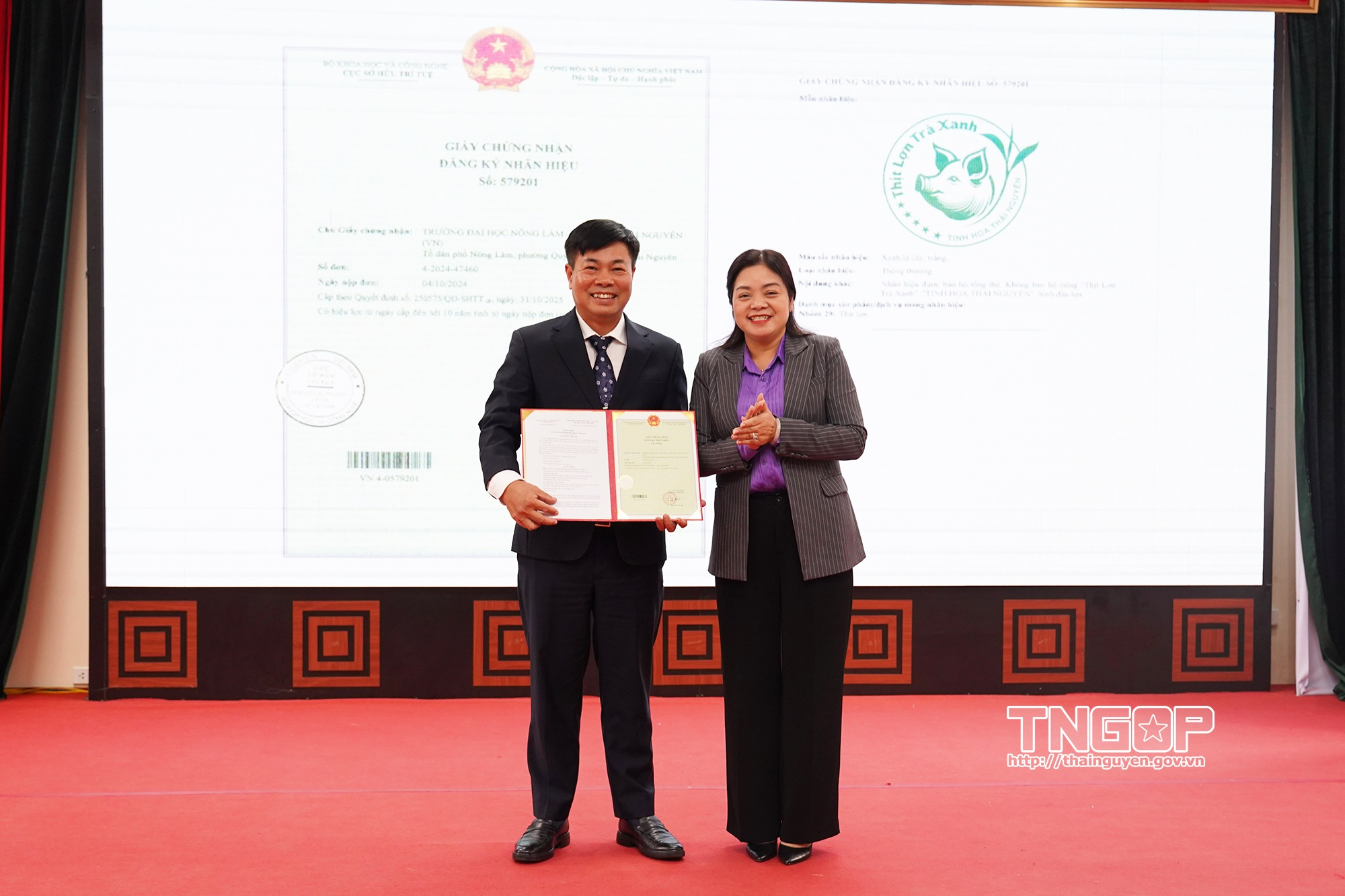 응우옌 티 로안(Nguyen Thi Loan) 성 인민위원회 부위원장이 농림대학에 “녹차 돼지고기 - 타이응우옌의 정수” 상표 등록증을 수여하고 있다