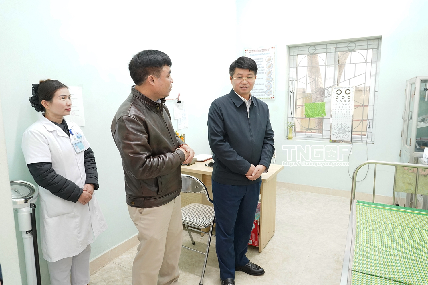 농 꽝 녓(Nong Quang Nhat) 성 인민위원회 부주석이 Thanh Thinh면 보건소를 방문해 시설을 점검하고 인력·의료장비 관련 애로사항을 청취하고 있다