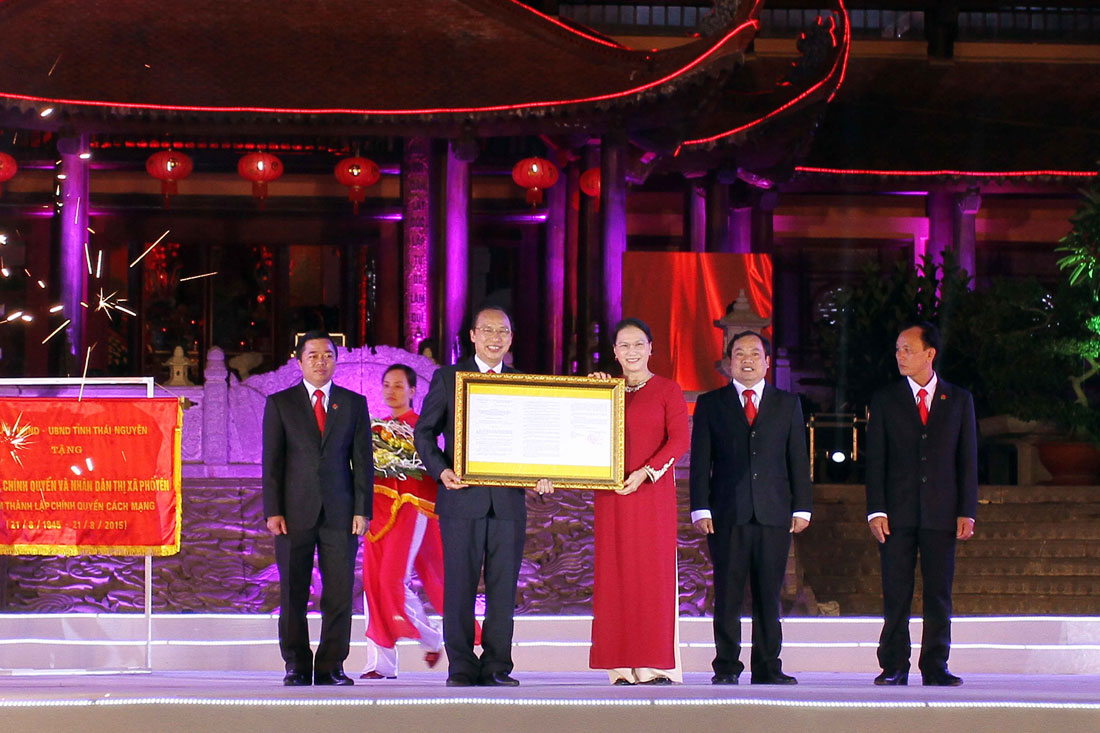 국회의장인 Nguyen Thi Kim Ngan은 타이응웬성 직하 Pho Yen시 창립에 관하여 국회상임위원회의 결정을 Pho Yen소시 지도자에게 수여했음