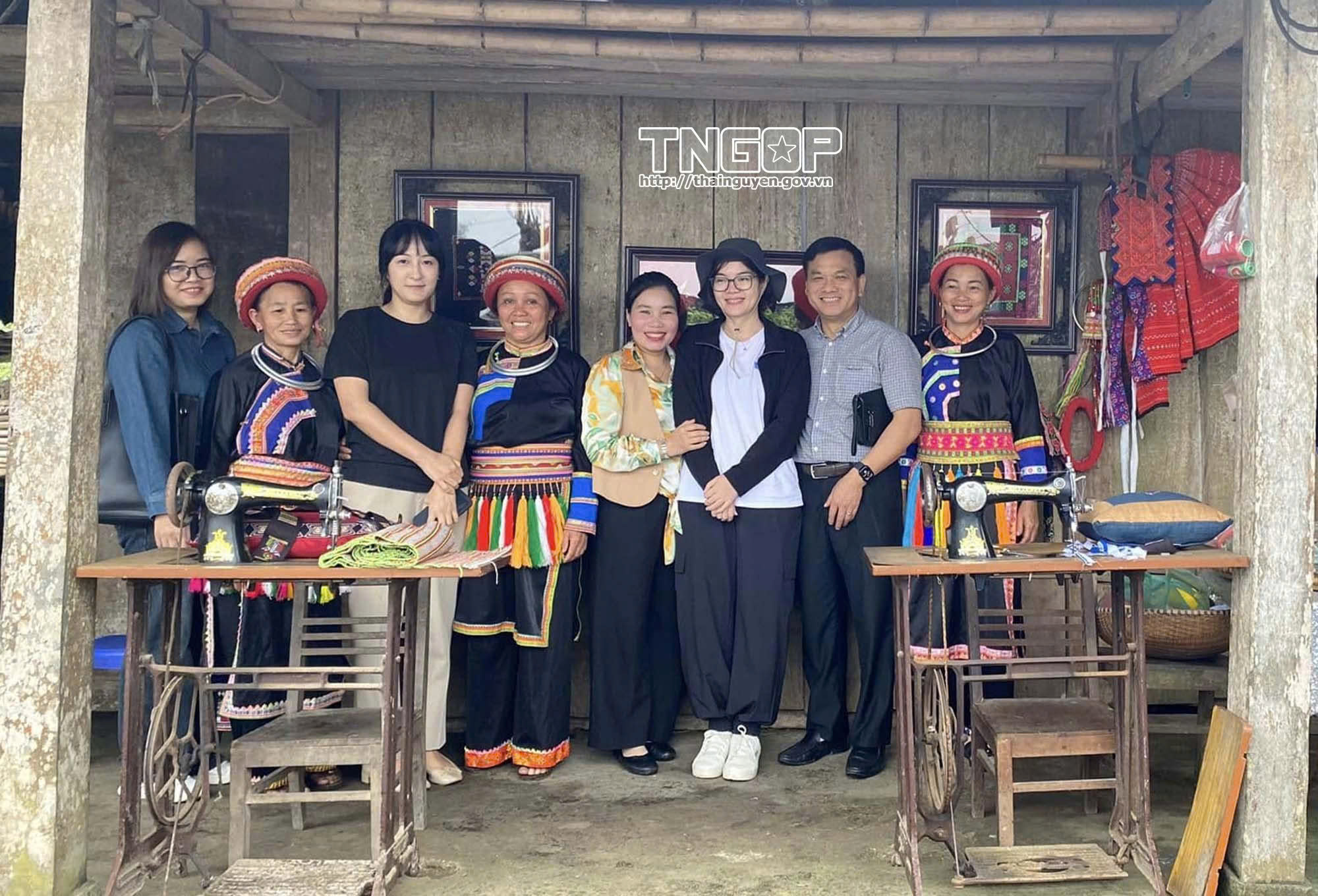 관광객들이 Thuong Minh 면 Phieng Phang 읍에서 Dao Que Lam 주민과 함께 체험 및 기념촬영을 하고 있다.