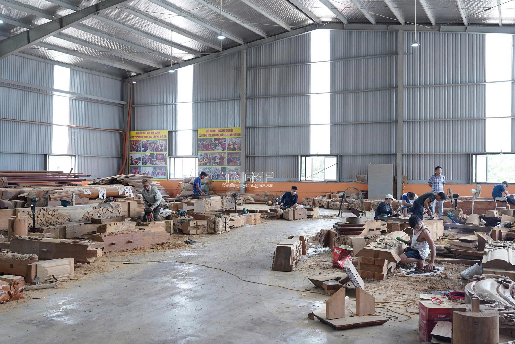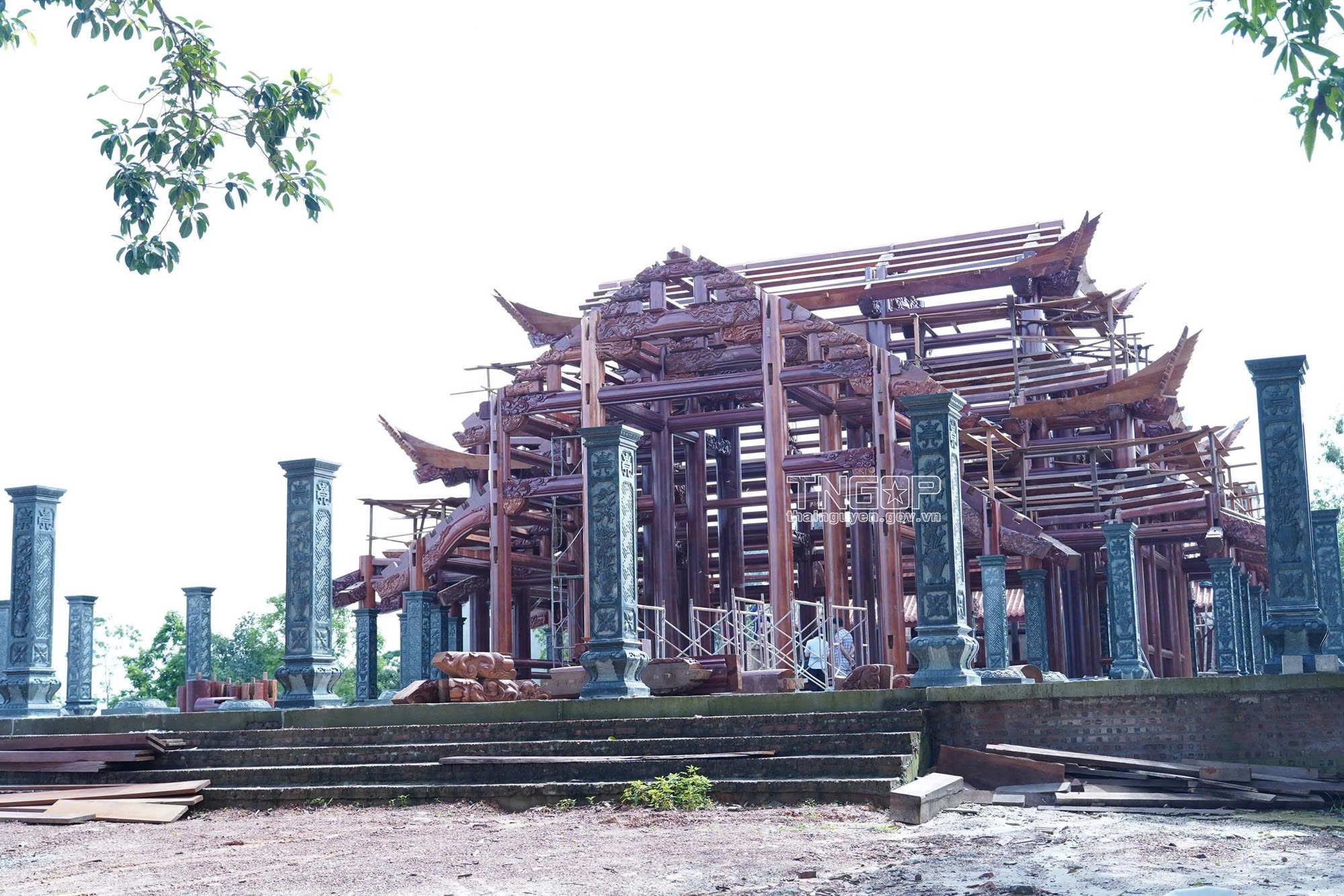 이번 사업은 삼문, 대웅보전, 조사당, 모전, 종루·북루, 리 남데 사당, 보존 건물 여러 주요 시설로 구성되어 있다. 현재까지 대웅보전은 60% 공정을, 조사당은 80% 공정을 완료하였다. 시공업체는 인력 투입을 강화하고 있으며, 대부분 박닌의 Dong Ky 타이응우옌성 유명 전통 마을 출신의 숙련된 장인들이다. 특히, 건물의 기둥과 틀은 모두 수작업으로 진행되어 전통 건축과 예술의 가치를 고스란히 담아내고 있다. 현재 조각 작업도 한창이며, 시공업체는 좋은 날씨를 활용해 남은 공정을 동시다발적으로 전개하고 있다.
