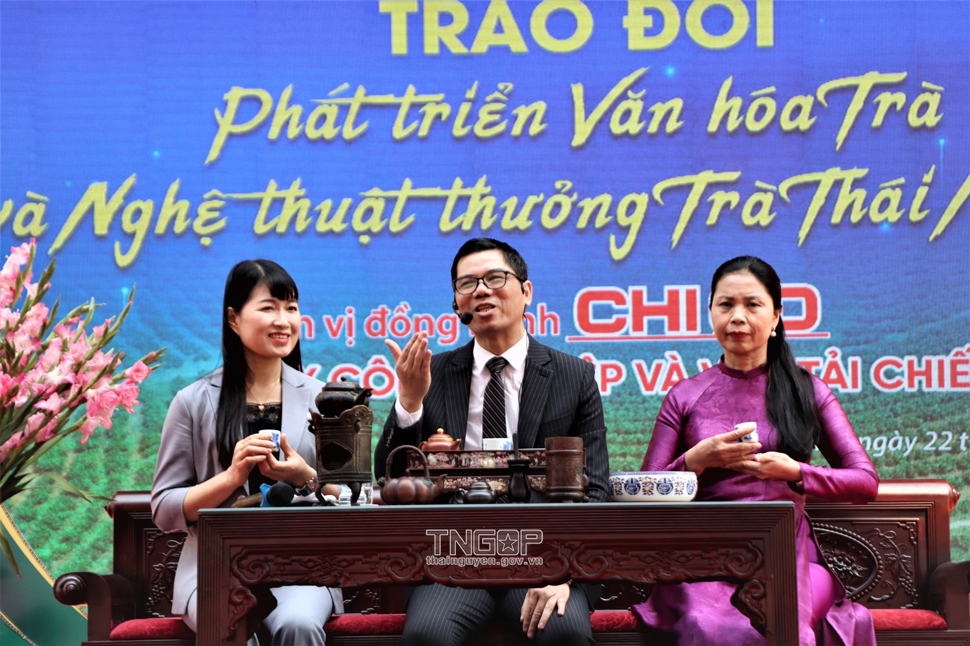 축제의 틀 안에서 차 문화와 타이응웬 다도 예술을 발전시키기 위한 교류 프로그램이 진행되었다. (사진: 차 예술가 호앙 안 수옹(Hoang Anh Suong)이 다도 예술을 소개하여 주민들과 관광객들에게 베트남 차 문화에 대한 더 깊은 시각을 제공했다.)